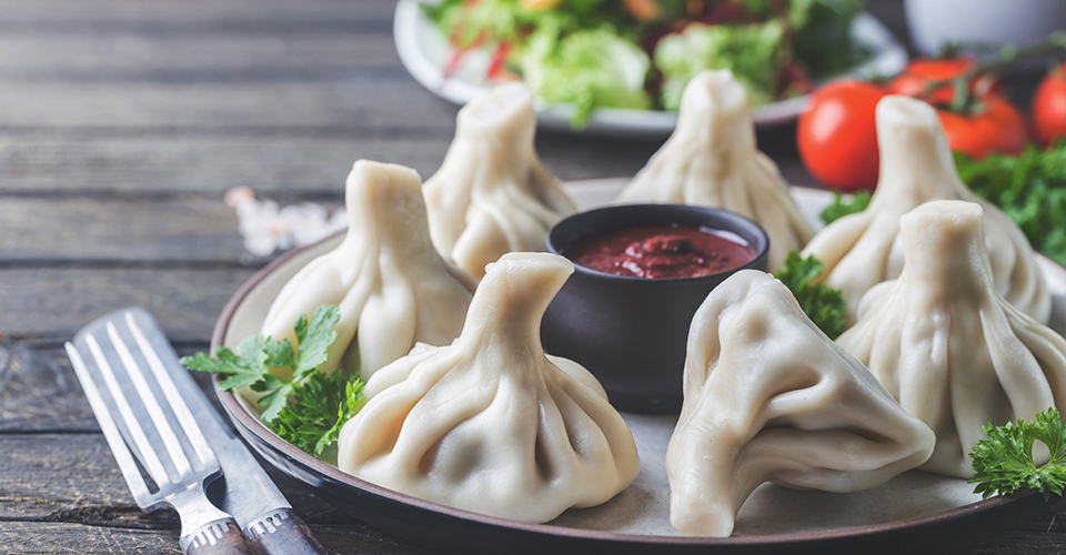 ジョージアを代表する料理として有名なシュクメルリとヒンカリ。シュクメルリは濃厚な鶏料理で、ジョージア西部ラチャ地方の山村シュクメルリに由来すると言われる伝統料理です。鶏肉を香ばしく焼き、その後、たっぷりのにんにくを加えた乳製ソースで煮込みます。ボリュームたっぷりの一品で、焼きたてのショティやトウモロコシのパンにつけて食べます。ヒンカリは、ジョージア全土で食べられる大型の肉入り水餃子で、小麦粉の皮で牛肉や豚肉を香草とともに包みます。中にはたっぷりの肉汁が含まれており、上部のねじれた「持ち手」をつかみ、まず中のスープを吸ってから皮と具を食べます。