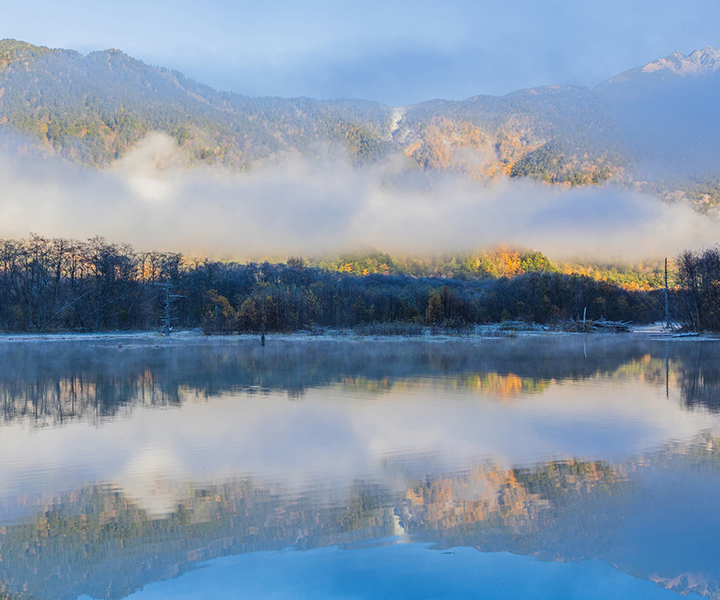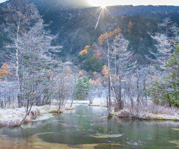 冬に近づくにつれ日照時間が短くなり、上高地の朝晩は冷え込みます。早朝には霧が立ち込めることも多く、写真では表現できない幻想的な風景が広がります。さらに11月上旬の早朝には、霜が降りてうっすら白くなった河童橋や、樹木に霜が薄く付く「霧氷」を見られることも。朝日に照らされてキラキラと輝く霧氷は、日が昇るとすぐに溶けてしまうため、早朝にしか見られない希少な光景です。