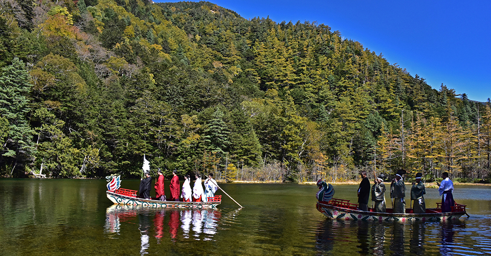 毎年10月8日、御船神事として行われる穂髙神社奥宮例大祭。山の安全を神に感謝するお祭りです。龍頭鷁首(りゅうとうげきしゅ)の2艘の御船で、平安装束に身を包んだ神官らが明神池を周遊します。