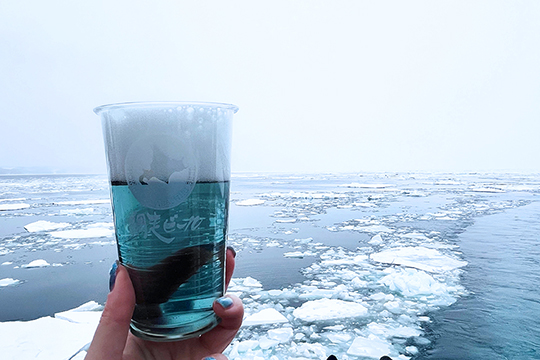 「網走流氷観光砕氷船おーろら」船内2階の売店で一番人気なのが、流氷をモチーフにした青いビール「流氷ドラフト」。透き通るような青色の発泡酒で、冬のオホーツク海の流氷を仕込み水に使用しています。フルーティーでスッキリとした風味が特徴で、ビールが苦手な方でも飲みやすい一杯です。