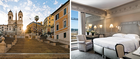 スペイン階段の頂上に位置する、ローマ市内中心部、絶好の立地を誇る名門ホテル。最上階にあるレストラン「IMAGO」からは美しいローマの景色が眺望できます。