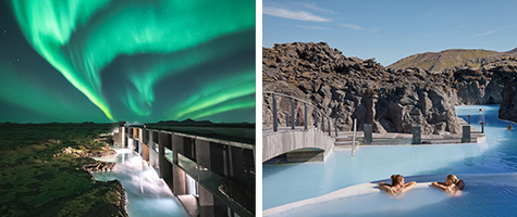 写真/左:ホテル敷地から観るオーロラ(イメージ)右:プライベートラグーン