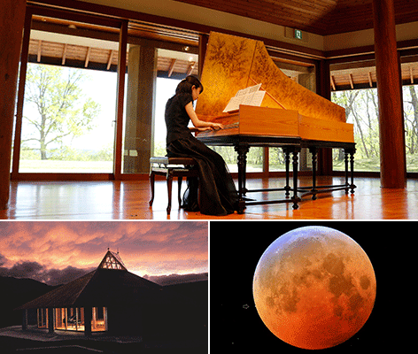 画像上:八ヶ岳カラマツ・チェンバロ演奏/左下:八ヶ岳高原音楽堂(外観)/右下:皆既月食 ※画像は全てイメージ