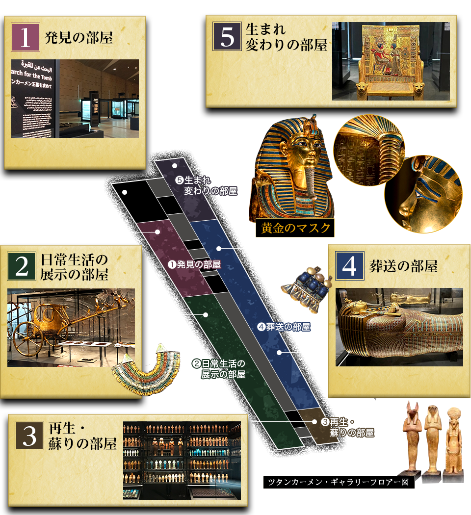 ツタンカーメンの生涯・宮廷生活・宗教儀礼・葬送儀式をテーマ別に分けて展示する構成となっており、展示品には、日本語のキャプションが付けられています。