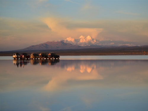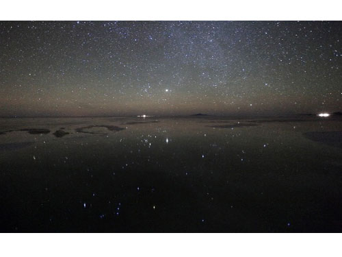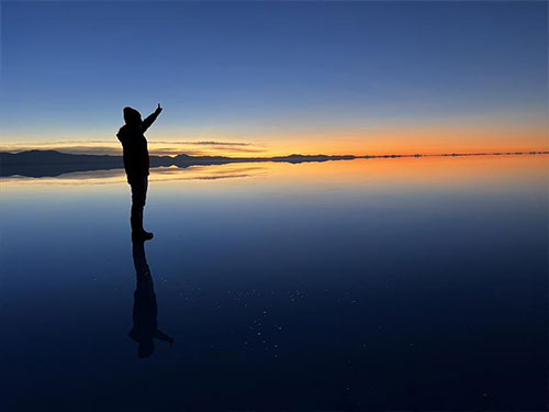 ウユニ塩湖が「天空の鏡」と呼ばれるのは、湖面に張った水が周囲の風景や人物などを反射し、一面鏡のように見えることからです!