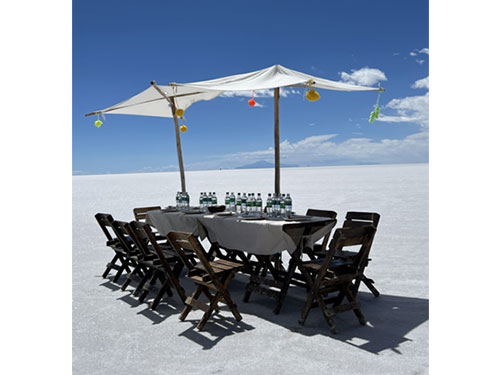 見渡す限り真っ白なウユニ塩湖に、テーブルを広げて楽しみます♪