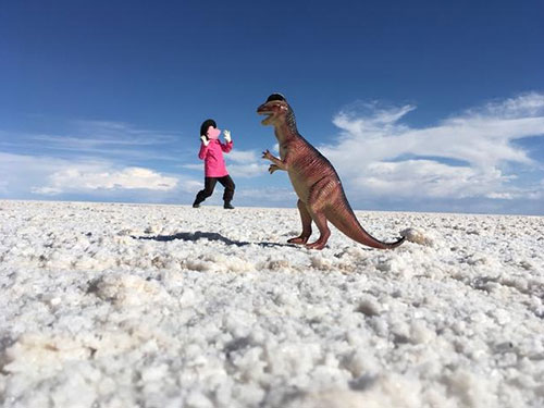 小さな車や恐竜のフィギュアは、ウユニ塩湖との相性抜群。