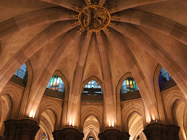 ガウディがサグラダ・ファミリア着工前に試みた実験的建築で、構造技術の集大成ともいえる地下聖堂です。逆さ吊り模型で導き出した曲線的な構造や、傾いた柱・放物線アーチなど革新的な設計が特徴。自然光が柔らかく差し込む内部は静謐で、ガウディの有機的建築理念を凝縮した空間として高く評価されています。