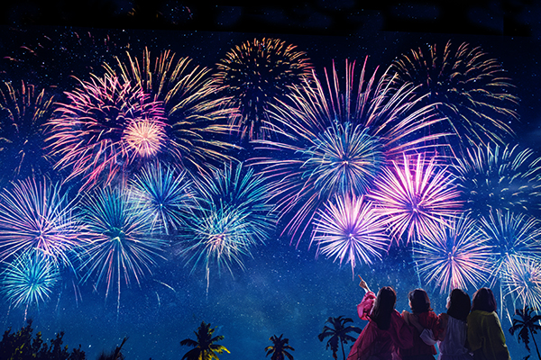南国の夜空に、数え切れない極彩色の花が咲く。