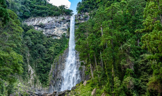 那智の滝は落差133m、太古の昔から神が宿る場所として崇められ、今もなお熊野那智大社の別宮・飛瀧(ひろう)神社の御神体として信仰の対象となっています。神社の参道からは滝を真正面に拝むことができ、自然と信仰が一体となった神聖な空間に、深い静寂と敬意が漂います。