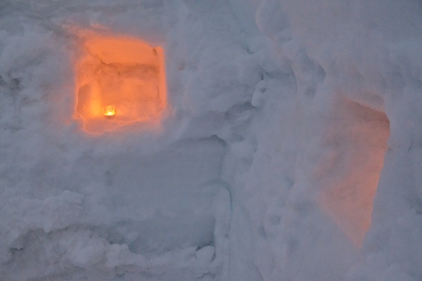 雪に覆われた路地の雪壁に雪灯籠が掘ってあり、優しい光が雪に反射して幻想的な風景です。