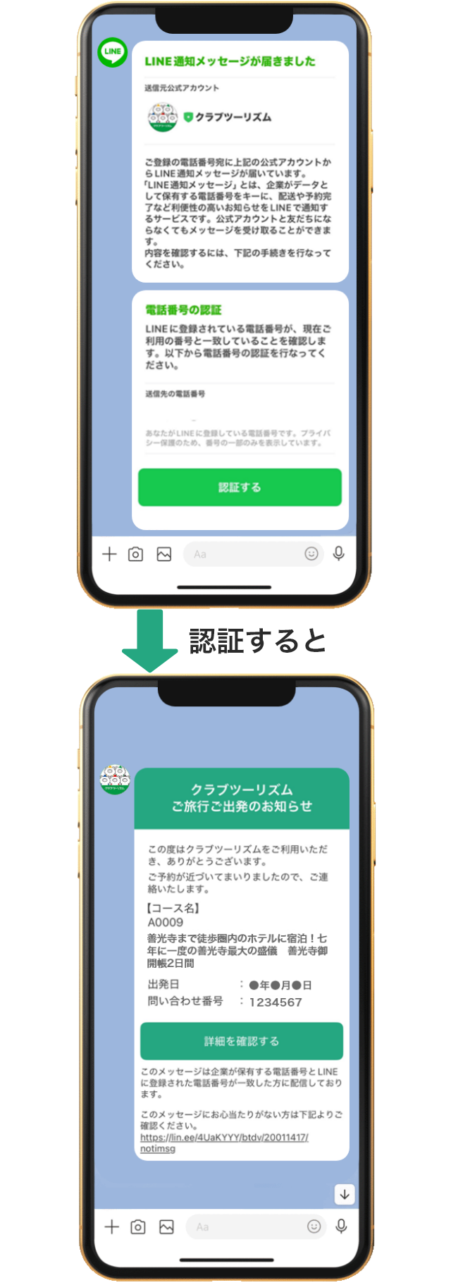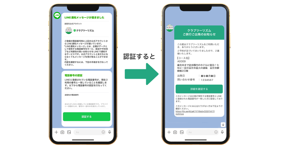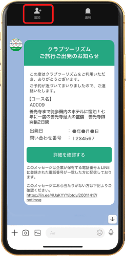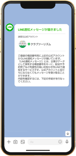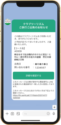 クラブツーリズムでは、LINEヤフー株式会社の協力を得て、「お客さまがLINEアプリに登録している電話番号」と「当社にご登録いただいている電話番号」を照らし合わせ、クラブツーリズムLINE公式アカウントと友だちになっていないお客さまにも、お知らせをLINEでお届けしています。当社のシステムを通じてメッセージを配信しており、LINEヤフー株式会社にはお客さまの個人情報は提供しておりません。また、個人情報を含むメッセージは配信することもありません。当社に登録されている電話番号に誤りがある場合や、LINEアプリに登録されている電話番号が最新でない場合、正確な通知が届かないことがあります。