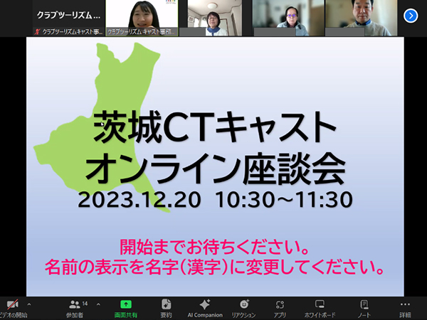 茨城県にお住まいの旅行モニタースタッフと、クラブツーリズム茨城旅行センターのツアー企画担当者がオンラインで座談会を実施し、今後のツアー企画や茨城県でのキャスト活動について意見交換を行いました。