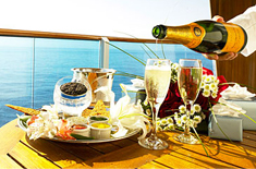 ご旅行中の楽しみであるお食事、船内には本格的なフルコースが食べれるメインダイニングや気軽に楽しめるブッフェスタイルのレストランがございます。船内のお食事には多彩で飽きることがないでしょう。