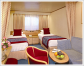 荷物をほどいた途端、バケーションが始まります。広々とした客室で、ゆったりお過ごしいただけます。内装は重厚で趣のある造りですが、機能性も兼ね備えており、落ち着いた雰囲気の中、洋上生活をお送りいただけます。