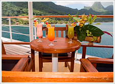 画家ポールゴーキャンが愛したタヒチの島々を巡る究極のラグジュアリーシップ。船内ではタヒチアン達がカラフルな衣装で伝統的な歌や踊りを披露したり、ポリネシアンダンスの手ほどきをしたり…、タヒチならではイベントが満載です。船尾からそのまま海に出られる施設を備えていますので各種マリンスポーツも十分楽しめます。通常の船旅では2回制となるディナータイムも1回制のフリーシーティング。お好きな方とお好きな時間食事を味わっていただけます。さらに夕食時にはその日のお食事にあったワインを無料サービス。客室内にご用意するお飲物もすべてご自由にお飲みいただけます。また、ノーチップ制なので日本人に馴染みの薄いチップについても心配する必要がありません。