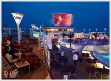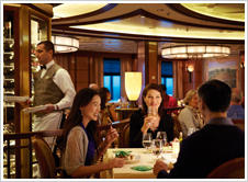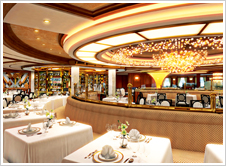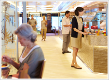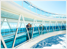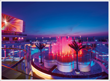 新造船ならではの新設備も加わりました。海上から40メートルの高さに設置されたガラス張りの回廊「シー・ウォーク」と「シー・ビュー・バー」。椰子の木と噴水を擁する「ファウンテン・プール」。そのほか、イタリア風アイスクリームバー「ジェラート」、「ペストリーショップ」が登場。洋上初のテレビスタジオ「プリンセス・ライブ」では料理ショーや音楽ライブなどが行われ、その場でも客室のテレビでも楽しめる新しいスタイルのエンターテイメントをご提供いたします。