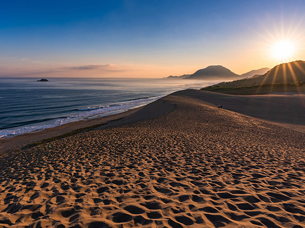 鳥取砂丘は年間約150万人が訪れる観光名所。東西16km、南北2.4kmに広がり、最大高低差は約90mという日本最大級の砂丘です。風で模様を作り出す「風紋」は一見の価値があります。「パラグライダー」「サンドボード」「ファットバイク」等のアクティビティも豊富にあり、自然を全身で感じられます。