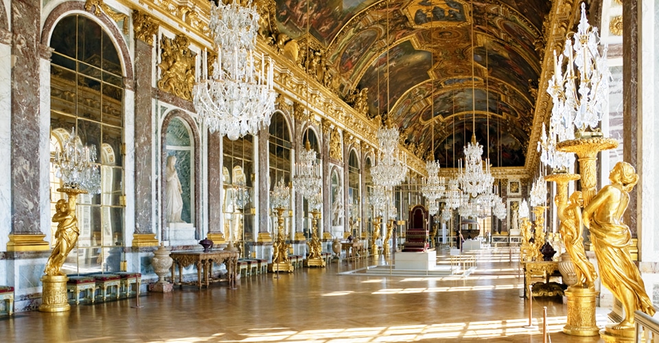 「鏡の間」は、第一次世界大戦後のベルサイユ条約が調印された場所。高さ12m、長さ75mの大回廊の壁一面に500枚以上の鏡や銀製品、調度品が設置され、息を飲むほどの美しさです。華麗な貴族文化を育みながら、フランス革命の舞台にもなるなど、数奇な運命に翻弄されたベルサイユ宮殿。当時の歴史について学んでおくと、より一層楽しめることでしょう。