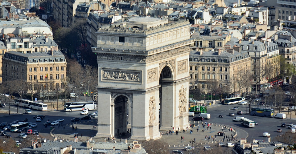 パリのシンボルであり、周辺からの眺めは圧巻です。シャンゼリゼ通りを散策した後は、そのまま正面にそびえ立つ凱旋門へ。真下から見上げる繊細な彫刻も、屋上からのパリの街並みも、その全てが魅力といえます。時間が許せば、234段の階段を上って屋上に出てみてください。最上部から望む360度のパノラマは圧巻です。