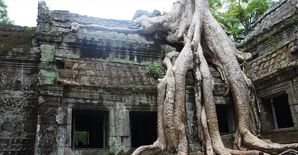 カンボジアの北西部、アンコール・ワットやアンコール・トムと同じく、アンコール遺跡群に含まれる寺院の遺跡です。アンコール・ワットとは逆に、元々は仏教寺院として建立されたのち、後世にヒンドゥー教の寺院に改修されたと伝えられています。遺跡の各所には、ガジュマルをはじめとする熱帯樹木の巨大な根が絡みつき、映画やアニメのような幻想的な風景が広がります。