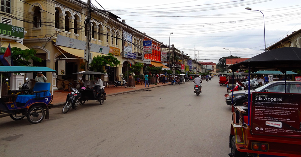 アンコール遺跡観光の拠点、メインストリートのシヴァタ通りにはホテルやレストランが軒を連ね、バイクタクシーやトゥクトゥクが行き交います。少し外れると、伝統的な高床式の家々がバナナやヤシの木に囲まれて立ち並ぶなど、のどかな光景が広がります。フランス植民地時代をしのばせるエキゾチックなオールド・マーケットでは、観光客向けの土産店も。特産の絹織物や工芸品などさまざまな物が集まり、見ているだけでも楽しいときを過ごせます。