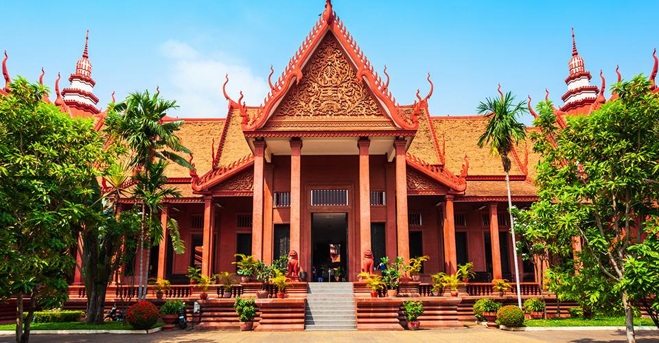 クメール様式で作られた屋根と破風、そしてカンボジアの大地を彷彿させる鮮烈な赤。建物そのものがカンボジアの歴史と文化を象徴した外観となっているのが、このカンボジア国立博物館です。プノンペン市街を流れるトンレサップ川のほとり、カンボジア王宮のすぐそばという好立地と、王宮と合わせても一日で回りきれるほどのちょうどいい規模なので、到着直後や帰国間際といった隙間時間でも気軽に立ち寄れます。