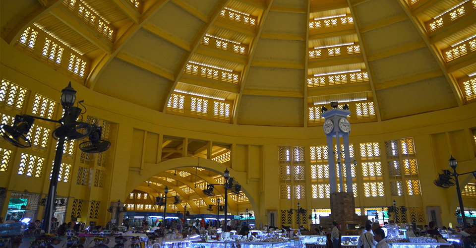 中央の巨大なドームから、四方に長い回廊が伸びる十字型の構造を持つのが、このセントラルマーケット。貴金属やジュエリーなどを扱う高級店が多く集まる中央のドーム部分は、市場というより百貨店といった趣がありますが、四方に伸びる回廊部は壁なしの半開放構造、青果から鮮魚・精肉、各種屋台といった、いかにも市場といった感じの店舗が軒を連ねています。お土産確保もグルメ満喫も、とりあえずここ一ヶ所で事足ります。