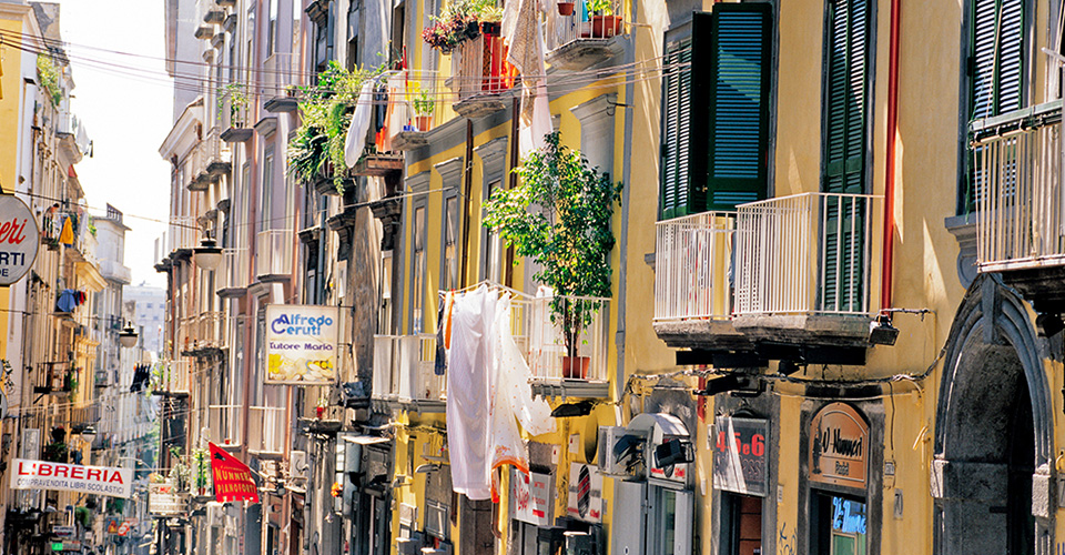 「これぞナポリ!」が感じられる下町情緒たっぷりの路地が行き交う旧市街地。街の中心を通りが貫いていることから「ナポリを真っ二つに割る」という名前が付いたといいます。ビア・ビッカリア・ベッキア通りとビア・ドォーモ通りの交差点がスパッカナポリの入り口で、路地に足を踏み入れると映画やテレビで観た頭上を洗濯物がたなびく風景がそこにあります。ひしめくように土産物屋や飲食店が建ち並んだ、活気溢れるナポリ屈指の観光名所です。