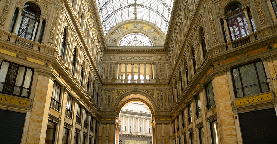 このアーケードは、1884年のコレラ流行の際、街の美化を目的にして、1887年から1890年にかけてミラノの「ヴィットリオ・エマニュエーレ2世のガレリア」をモデルに造られました。ミラノのガレリアよりも規模は小さ目ですが、高い天井と足下のきらびやかな黄道12星座のモザイク画が美しく、思わず目を奪われます。自分の星座の前で写真を撮るのが旅行者の定番。中心部の広場は、ファッションショーや美術展、コンサートの会場にも利用されています。