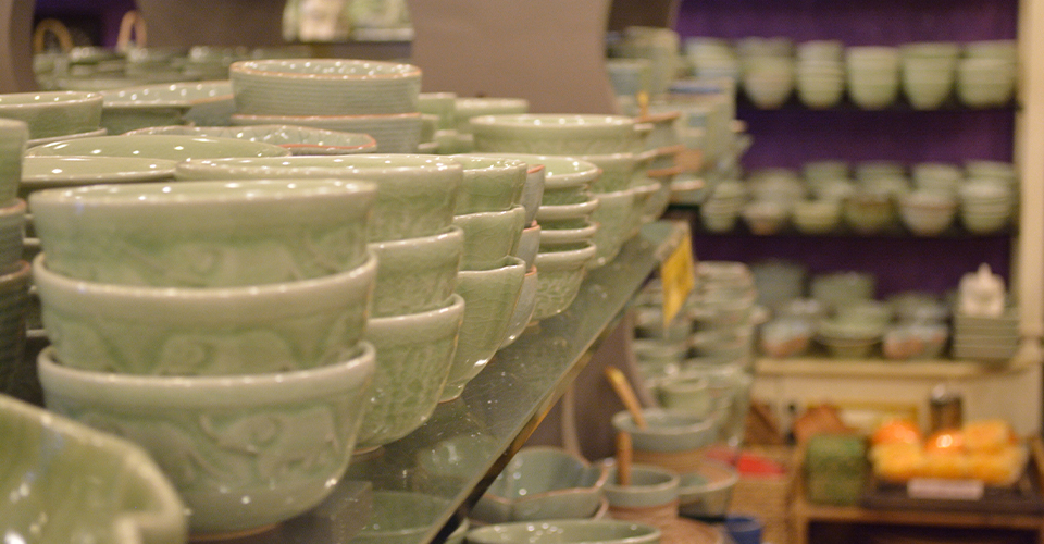 「セラドン焼き」とはタイの伝統的な青磁器で、定番土産として知られています。その歴史は古く、700年以上も前から作られており、「セラドングリーン」と呼ばれる淡い緑色が特徴的です。他に青色や白色のセラドン焼きもあり、どれも色合いが美しいため、置くだけで食卓をパッと明るくしてくれます。バンコクにある雑貨店「The Legend(ザ・レジェンド)」では、カップやお香立てなど小さなセラドン焼きの商品を扱っており、お土産探しにおすすめです。