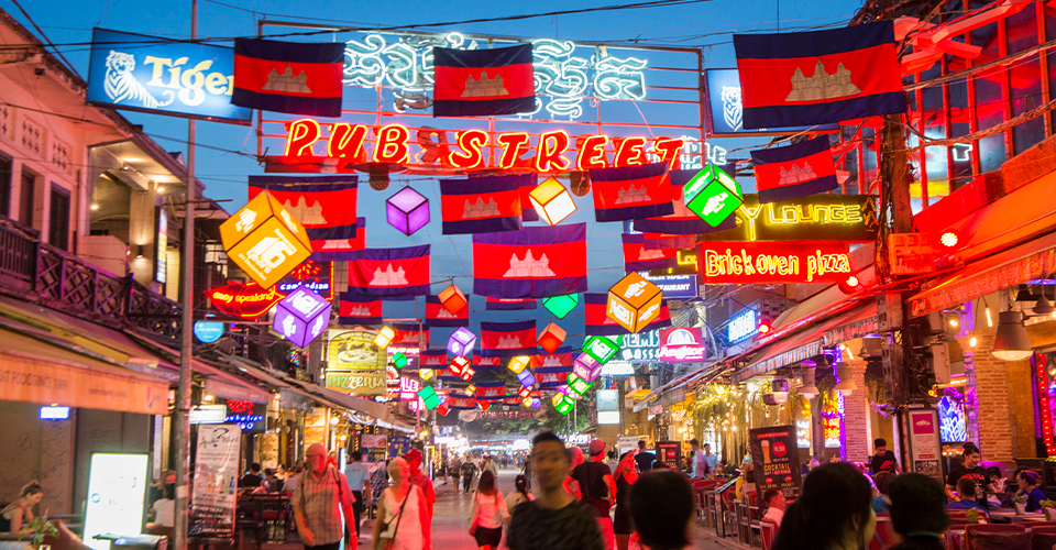 「シェムリアップ」はカンボジア北西部の都市。シェムリアップ空港から車で20分でアクセスできます。中心部にはホテルや市場が数多くあり、アンコール・ワットやトンレサップ湖などの観光拠点として栄えています。シェムリアップ川沿いにある「オールドマーケット」は、お土産や食品が充実しており、日本人が経営する「カンボジア・ティー・タイム」では伝統菓子「ノムトンムーンチョコレート」を購入できます。アンコール・ワット観光の宿泊は、車で10分の場所にある「グランド ヴィーナス ラ レジデンス」がおすすめです。