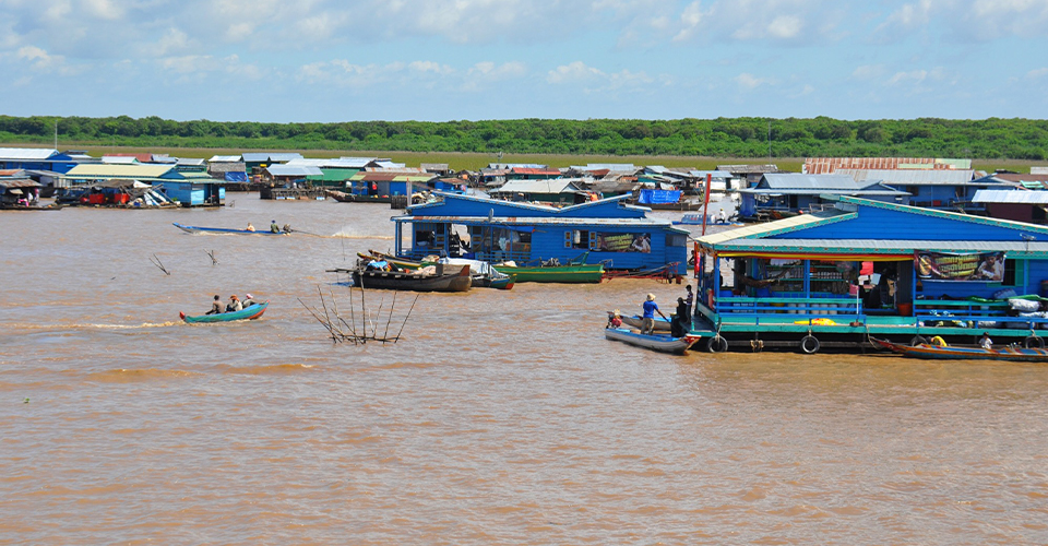 「トンレサップ湖」は東南アジア最大の湖。湖上には5~8mの水深に耐える高床式の建物が見られます。シェリムアップ市街地から車で約30分の「チョンクニア」と、約50分の「コンポン・プルック」等の村でクルーズ観光ができます。どちらも30ドル程度で所要時間は1時間半、湖上の建物群や現地の人々の暮らしを伺えます。チョンクニアでは水面に沈む夕日を眺められ、コンポン・プルックではマングローブ林を進むコースもあります。湖には300種類以上の淡水魚が生息しており、ツアーによっては釣りを楽しめます。