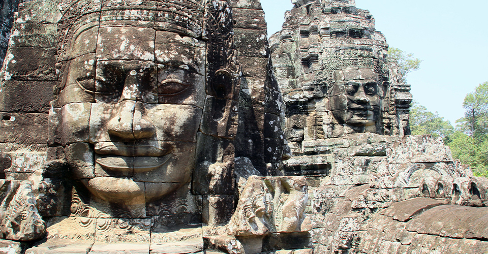 「アンコール・トム」はアンコール・ワットの北に位置する石造りの城塞都市。堀に囲まれており、東西南北にある5つの橋から入れます。中心部にある「バイヨン寺院」は大乗仏教とヒンドゥー教の建築方が入り混じっており、途中から石の積み方や材質が異なっています。壁面には、1170年代にトンレサップ湖上で起きた戦争の場面や当時の市場の様子が精密な彫刻によって記録されています。敷地内に観音菩薩の顔を型どった「クメールの微笑み」が4面に彫られた大きな塔が50個以上あり、撮影スポットとして人気です。