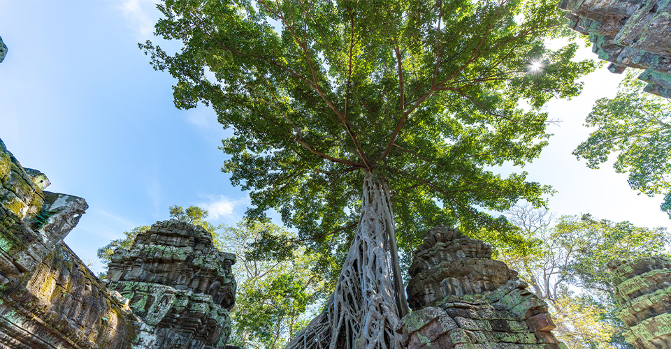 「タ・プローム」は「アンコール・ワット」から北東に約6kmの場所にある寺院です。樹齢300年の樹木によって押しつぶされるように浸食されており、自然の生命力を感じられます。映画「トゥーム・レイダー」のロケ地になったほか、木の根が張りめぐらされ苔むした遺跡は、日本の有名アニメ映画の舞台をほうふつさせます。シェムリアップ中心部にある「タ・プロームホテル」では、木をふんだんに使った暖かみのある内装と、屋内プールやスパで旅の疲れを癒せます。周辺の繁華街では夜遅くまで食事や買い物を楽しめます。