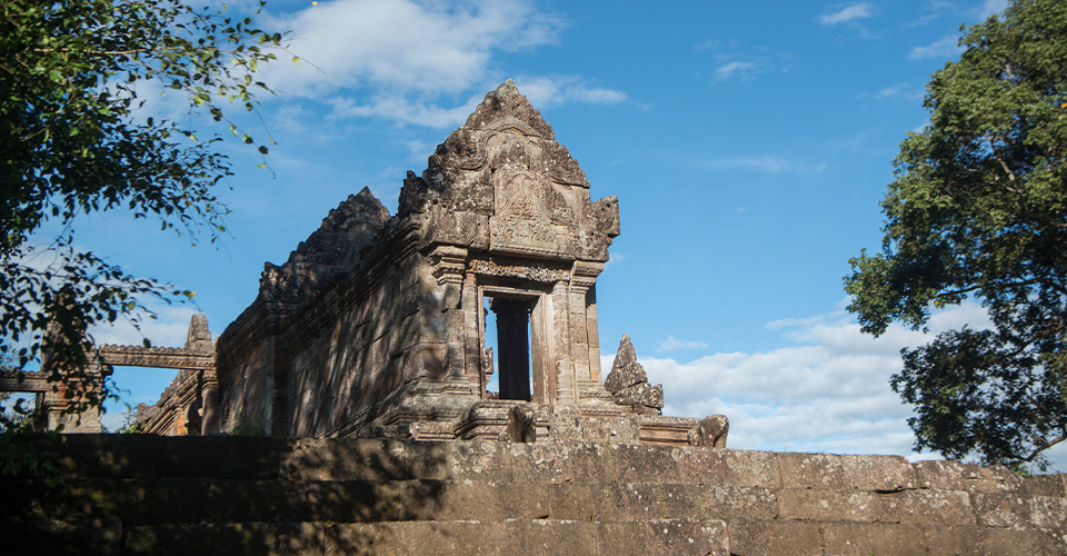 「プレアヴィヒア寺院」はカンボジアとタイの国境に広がる標高625mのダンレク山地にあります。高低差120m、長さ800mの参道、形の異なる5つの門、ヒンドゥー教の神「ヴィシュヌ」を祀る中央のお堂からなり、建物の随所に「乳海攪拌(にゅうかいかくはん)」「ラーマーヤナ」等の神々が彫刻されています。寺院の後ろは断崖絶壁で、絶好の撮影ポイントとなっています。カンボジアの大地を一望できることから、「天空の寺院」「アジアのマチュピチュ」とも呼ばれています。観光の所要時間は約1時間です。