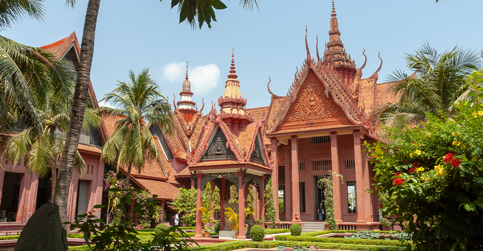 「プノンペン国立博物館」は首都プノンペンの王宮のすぐ北にある歴史博物館です。クメール王朝の建築様式を模した、赤が印象的な建物。1920年に開館し、「ロリュオス遺跡群」「アンコール遺跡群」を築いた6世紀~15世紀の出土品を、仏像を中心に5,000点以上展示しています。高さが1mを超える「横たわるヴィシャヌ神」等のヒンドゥー教における神や歴代の王の像や彫刻、実際に叩けるカンボジアの楽器、青銅器や漆器等、見どころがたくさんあります。緑あふれる中庭の池で、コイやカメに餌やりもできます。観光の所要時間は約1時間です。
