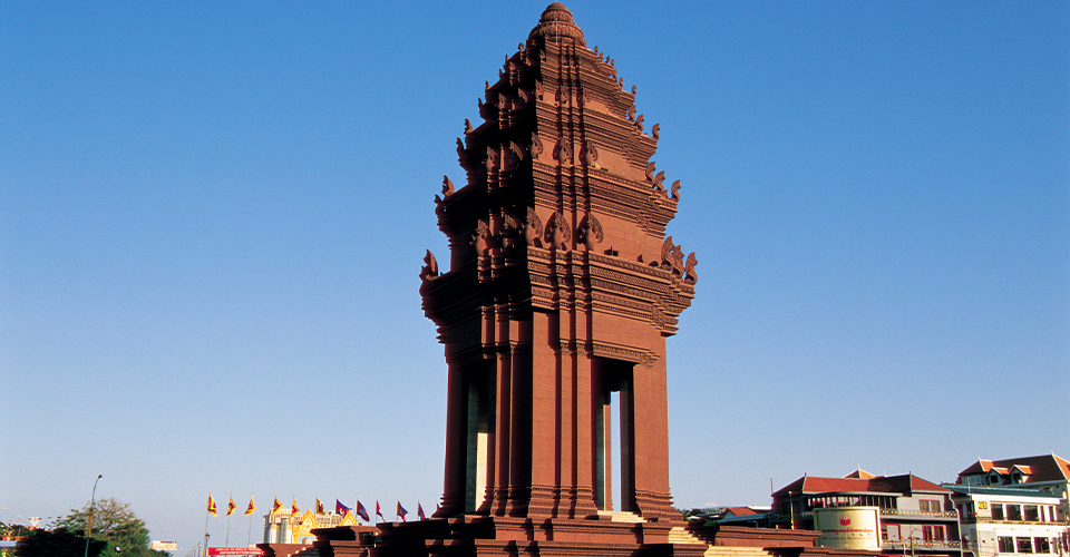高さ20m、赤褐色の「独立記念塔」は、首都プノンペン中心部にあり、フランスからの独立を記念して1958年に建造されました。「アンコール・ワット」と同じ山岳型の建造物は、清らかさや悟りの象徴とされる蓮の花がモデルになっています。周囲は緑豊かな公園で、のんびりとくつろげます。夜になるとライトアップされるほか、独立記念日の11月9日にはセレモニーが開催され、国王や首相がパレードを行います。徒歩30分圏内には王宮や「シルバーパゴダ」寺院、「セントラルマーケット」等の有名観光スポットがあります。