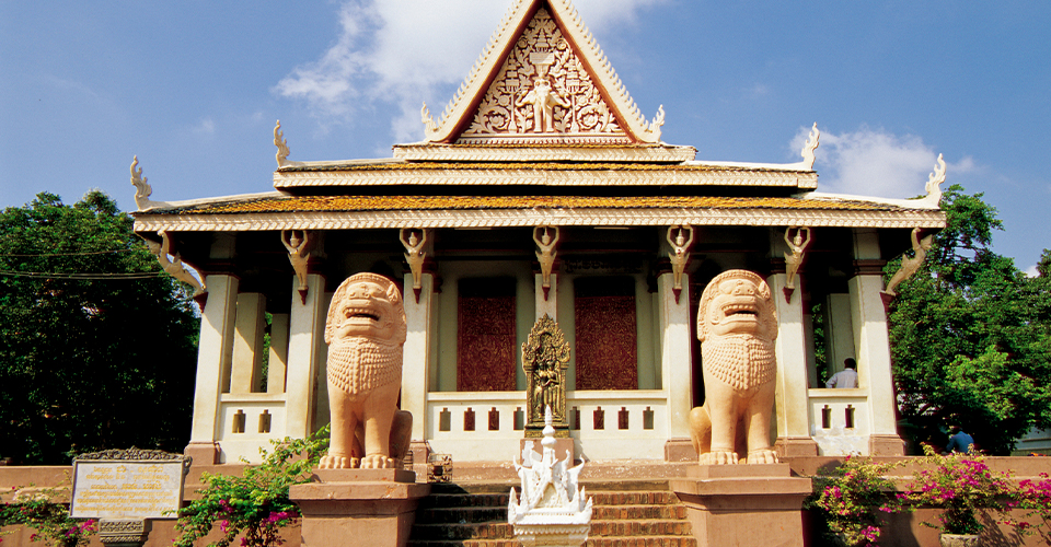 「ワット・プノン」は、首都プノンペンの王宮から徒歩25分の場所にある寺院です。クメール王朝時代に4体の仏像を祀り建立したのが始まりと言われています。本堂へ続く階段には、兵士や守り神の獅子「シンハー」、神話の蛇「ナーガ」の彫刻があります。本堂には黄金の仏像が置かれ、仏教説話の絵画が壁や天井に描かれています。境内にはほかにも、寺院を創建したペン夫人のほこら、芝生を利用した大きな時計、本堂よりも高くそびえ立つ仏塔があります。寺院の入場料は1ドル。1時間半ほどで見学できます。