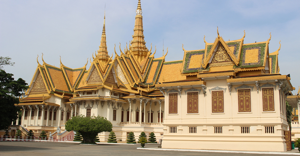 首都プノンペンの川沿いに、カンボジア国王の住まい「王宮」があります。1870年に木造で建てられた「即位殿」は、フランス植民地時代の1919年に再建設され、黄金の瓦屋根とレンガ造りの建物になりました。手入れされた低木や花々が咲く広大な庭をゆっくりと散策できます。観光の所要時間は1~2時間。肩や膝が見える服装や着帽、大きなバックパックを持っていると入場できないため、注意しましょう。