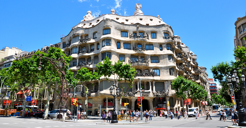 バルセロナの目抜き通り「グラシア通り」に面した6階建ての集合住宅。アントニ・ガウディの代表作として知られ、現在も4世帯が居住しています。特徴は、建物内に直線部分が一切なく、すべて曲線のみで構成されていること。外観だけでも十分見ごたえのある建物ですが、ガウディの世界をより体感できる内部をぜひ見学してください。内部を見学する場合、入場チケットが必要になります。事前に予約して行くのがおすすめです。また、建物内にはカフェ兼レストランの「カフェ・デ・ラ・ペドレラ」があり、優雅なひと時を過ごせます。