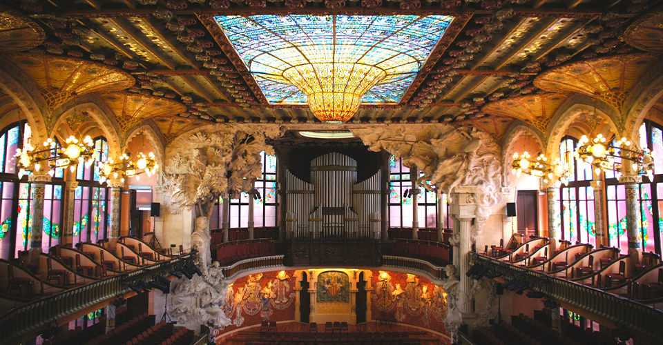 バルセロナ市内の中心地にあるコンサートホール。ガウディと同じ時期に活躍した建築家モンタネールにより、1908年に建築されました。外観が美しいのはもちろん、内部はとても繊細な装飾が施され、息を飲む美しさ。特に、天井にあるステンドグラスは圧巻です。現在も現役のコンサートホールとして、クラシックコンサートをはじめ、フラメンコやスパニッシュギターのショーなどが開催されています。ドレスコードはありませんが、せっかくなのでお洒落して行くのがおすすめです。