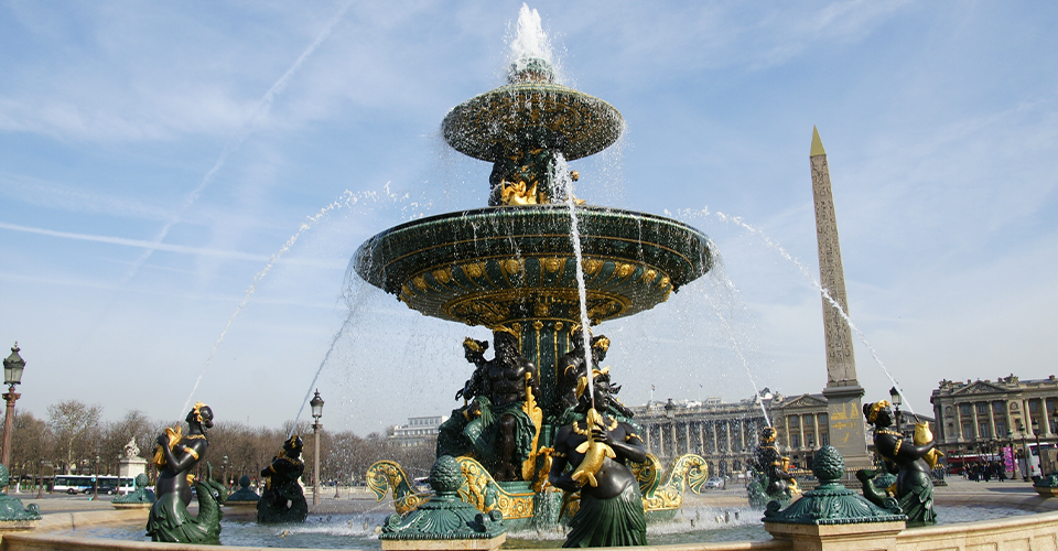 「コンコルド広場」はパリ中心部に位置し、2つの噴水や高さ約21mの記念碑「クレオパトラの針」がある公園です。1755年に作られた広場は、フランス革命時にはルイ16世やマリー・アントワネット等の刑場として使用されました。その後、1833年にエジプト国王から友好の証として記念碑が寄贈され、この広場の中央に立てられました。現在は「シャンゼリゼ大通り」「ルーブル美術館」等の観光地や百貨店、ホテルへ行き交う人々の憩いの場となっています。場内の噴水はそれぞれデザインが異なり、眺めているだけでも楽しめます。