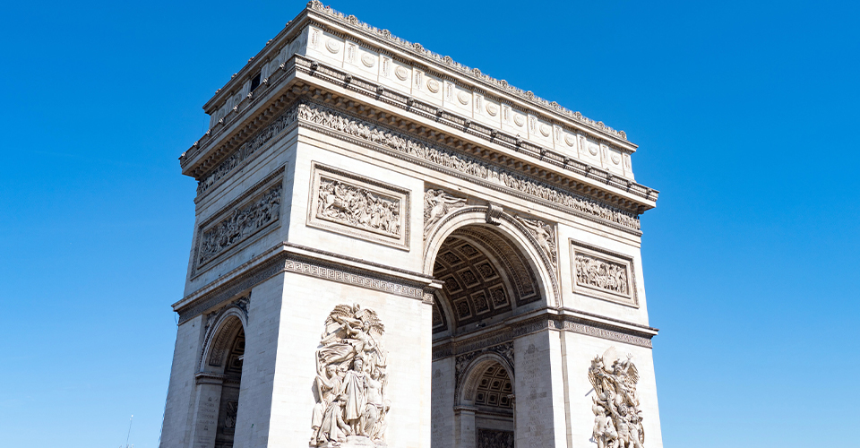 「エトワール凱旋門」はパリ北西部のシャルル・ド・ゴール広場に建つ高さ50mの門です。壁面には門の建築を命じたナポレオンに関する彫刻が飾られているほか、アーチ状の天井部分にも繊細な装飾が施されています。屋上は展望台(有料)になっており、コンコルド広場まで延びるシャンゼリゼ大通りや、夜にはライトアップされたエッフェル塔を見られます。お年寄りや身体が不自由な人のためのエレベーターも用意されています。キャリーケースやバックパック等の大きな荷物は持ち込めないため、駅周辺のコインロッカーを利用しましょう。