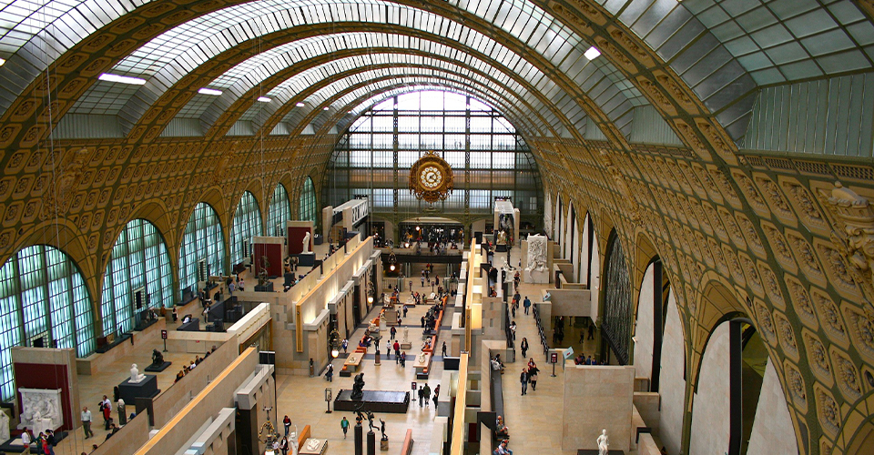 パリ中央にある「オルセー美術館」は駅舎を改築して作られました。館内には黄金の大時計やドーム状の天井がそのまま残されています。19世紀美術の専門美術館として知られ、ミレーの「落穂拾い」、ゴッホの「自画像」等の1848年~1914年までの美術作品を中心に、絵画や彫刻、アールヌーヴォーの家具等を展示しています。入館者限定のレストラン「ミュゼ・オルセー」では、白い壁や天井に黄金の装飾が施された豪華な空間でフランス料理をいただけます。館内に複数あるガラス張りの大時計からは、パリの街を見渡せます。