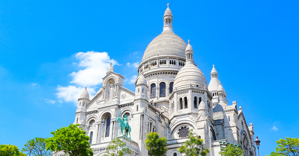 パリで最も高いモンマルトルの丘にある「サクレ クール寺院」は、戦争や内乱による被害者を追悼するため、1914年に建設されました。3つのドーム状の屋根とキリスト教の聖人が描かれたステンドグラスが特徴的です。中央祭壇の天井に描かれたイエス・キリストのモザイク画は、475㎡と世界最大級。さらに奥にある小礼拝堂には、聖母マリアを描いた天井画があります。300段ものらせん階段を上がった展望台(有料)からは、パリの街並みを一望できます。