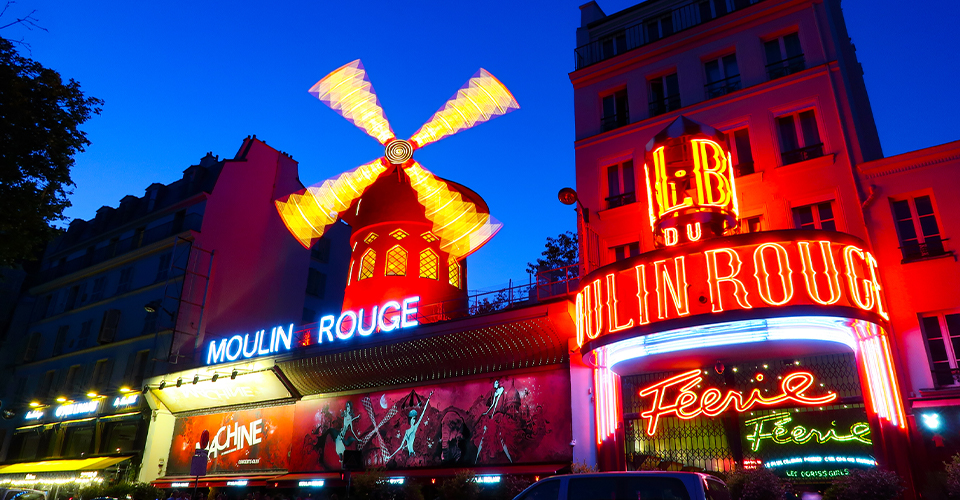 赤い風車が乗った屋根が目印の「ムーラン ルージュ」は、パリ北部にあるキャバレーです。1889年の開業から、パリがドイツ軍の占領下にある中も営業を続け、国を越えて人々を魅了してきました。ショーを見る際は、男性は襟付きのシャツにジャケット、女性はワンピースにクラッチバッグ等のエレガントな装いがドレスコードとなっています。