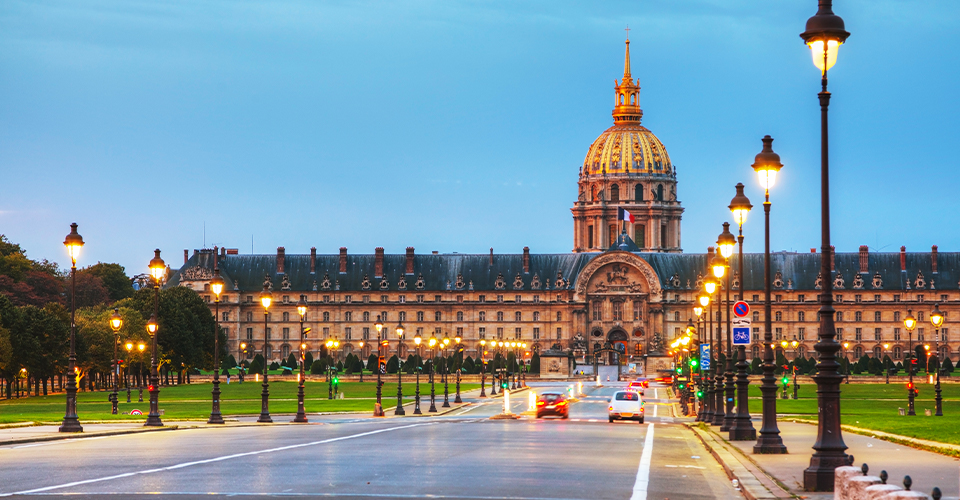 「アンヴァリッド廃兵院」はパリ中心部の西、エッフェル塔から徒歩20分の場所にあります。1671年に退役軍人のための病院として建てられ、その後ルイ9世を安置する礼拝堂を増設。地下墓所にはナポレオン1世が眠る大理石の棺桶があり、間近で見学できます。ドーム状の天井にはルイ9世とキリストが描かれています。建物の一部は「フランス軍事博物館」として、中世の鎧から第二次世界大戦の軍服、戦車等の軍事品、歴代の君主の絵画までを時代順に展示しています。敷地は広く、一通り見て回るには1時間かかります。