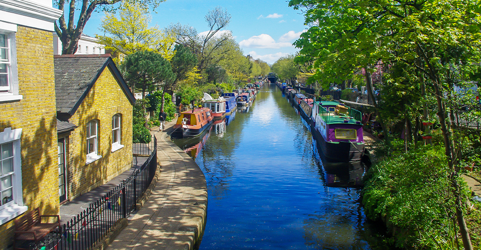 ロンドン北西部のパディントン駅を降りると、目の前に「リージェンツ運河」が流れています。この運河は、19世紀初頭に、新しい交通網を作る構想の一環として掘られたもの。緑あふれる一角は、詩人のロバート・ブラウニングらによって「リトル・ベニス」と名付けられました。都心とは思えない静かな時間が流れ、水際のカフェでゆっくりと過ごせます。またカムデン・ロックまで可愛らしい遊覧船が運行しており、水上生活を営む人々の船やウィンフィールドハウス、ロンドン動物園等、一味違ったロンドンの風景を楽しめます。
