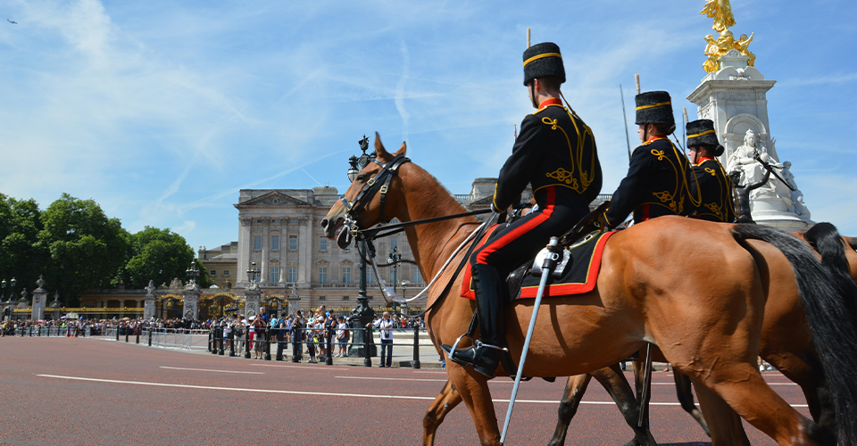 ヴィクトリア女王の治世からイギリス君主の公邸となったバッキンガム宮殿。約1万坪の敷地には舞踏会場、音楽堂、美術館、接見室等が設けられ、夏季の2か月間は一般入場も可能になっています。有名な衛兵交代は、毎週月水・金・日曜の11:00に実施(公式サイトで確認を)。宮殿正面のゲート周辺は10:30には人でいっぱいになるため、10:00過ぎには到着するようにしましょう。カフェ&ショップは宮殿の外にあり、コーギー犬のぬいぐるみがお土産として人気です。